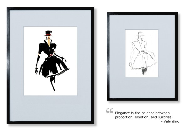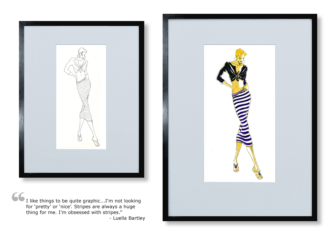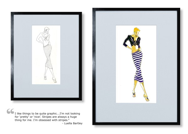 From the very first pencil sketches until the end results in full color, we’re pleased to feature these two special pieces from the FASHION+ART Gallery.  STATE IT IN BLACK from the PURE FASHION COLLECTION and SAIL AWAY ONE TWO from SOLITAIRES.