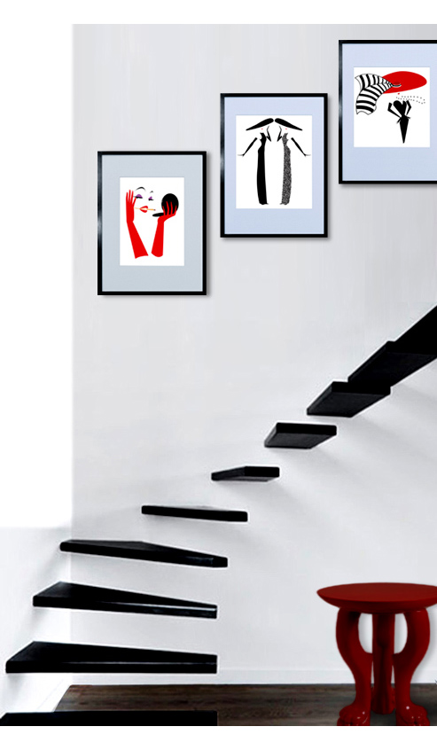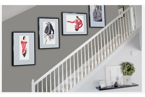 That wall along the stairs is a natural gallery space, isn’t it? And in most homes, this area is usually crammed with—what else?—family photos. Pictures of the kiddies missing their baby teeth. Grandma and grandpa’s wedding portrait. Family members in uniform. For whatever reason this particular space has been designated as THE spot to display a family’s history. Right? But what if your family wasn’t the picture-taking kind? Or your selfish sister has run off with moms’ photo album? Do you leave the space bare and wait for time to fill it up? Heck no! Here’s your chance, Babydoll, to break clear out of that cage! Go on and take it to another level! Turn that space into a place to showcase artwork that your guests will actually want to climb the stairs to oooh and ahhh over. Need some ideas? You know we’ve got ’em—
