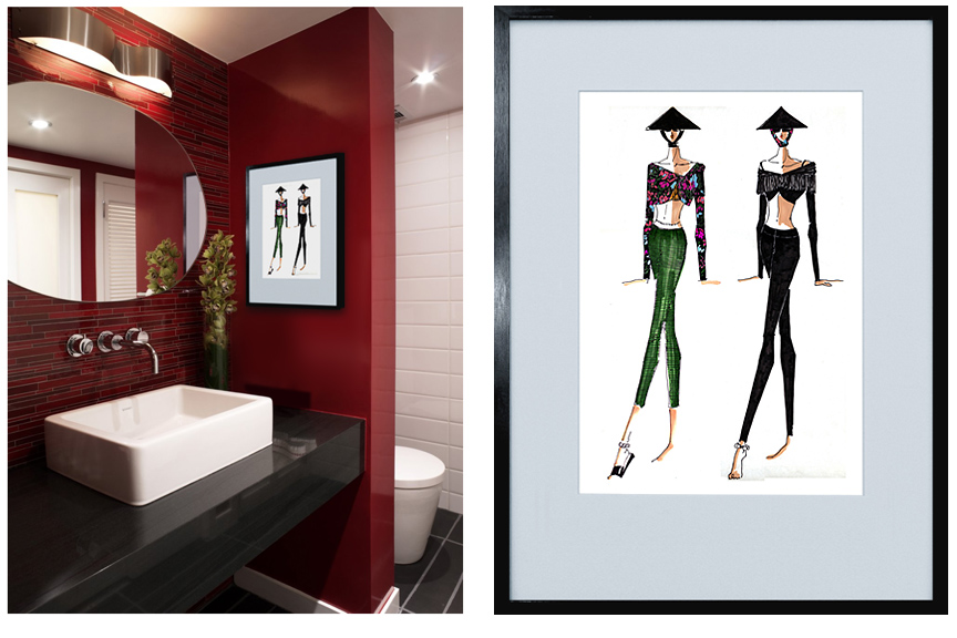 So what do you think? Hair salon? Dentist office? Design firm? Or maybe YOUR house? Wherever you might imagine this eye popping bath by Foshay Design, our piece from The Croquis Collection adds a delightful tweak. Everything works together here. The clean lines. The balance of black with rich color on white. I think it’s the perfect finishing touch. Just one of 42 finishing touches—each and every one perfect—in the FASHION+ART Gallery.