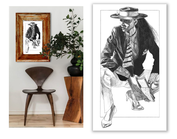 I love woods. Light woods. Dark woods. Weathered and worn or slick and highly varnished. And I love to mix them together. Just like this. Now, you could bring more color into this corner. It’s strong enough to take it. But let’s allow the richness of wood to carry the color instead and turn a spotlight on the black and white opulence of TAKING CARE OF BIZNESS. She enhances things quite nicely, don’t you think? All tucked into this peaceful corner from RUE Magazine like she owns it.