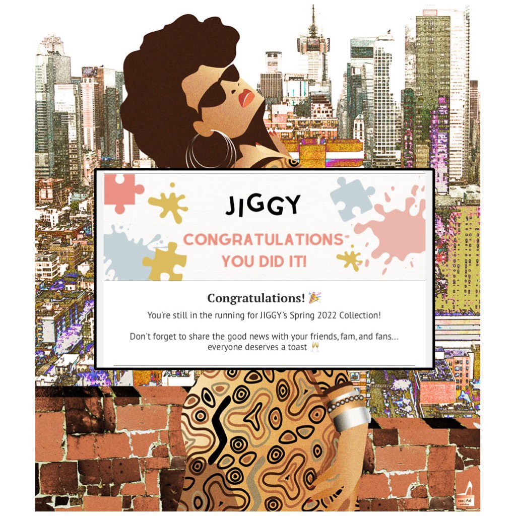 Now the JIGGY judges will determine, from the remaining 50, which will make up the Top 25 entries. And then we’re trotted out for one more public voting. So stay tuned and get ready. I might need another big push from you to put her in the winning Top 6, becoming one of JIGGY’s Spring 2022 Collection. Wouldn’t that be cool? Let’s do it!!!