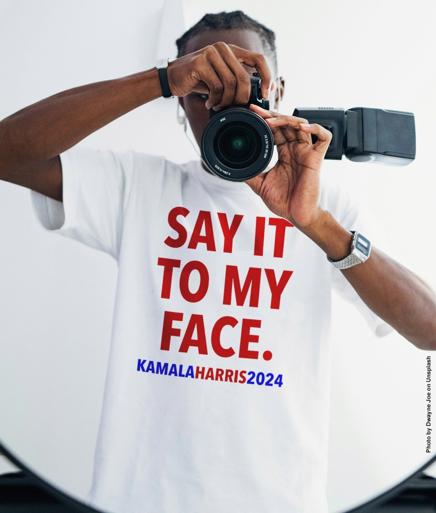 Hop on and ride the KAMALA HARRIS train while wearing the proper gear. SAY IT TO MY FACE t-shirts are available in S, M, L, XL, 2XL and 3XL. 25.00. 2 for 40.00. 2XL and 3XL add 3.00.